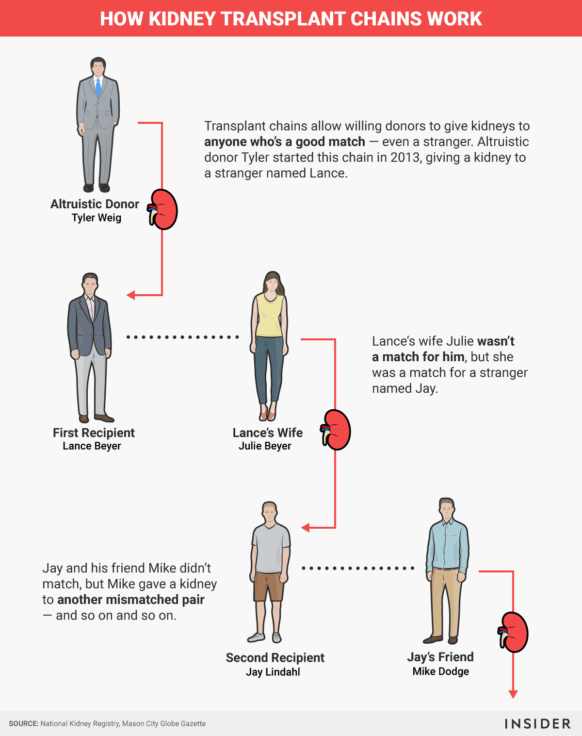 It’s a relatively new innovation in the medical world: Simple kidney swaps between two pairs of unrelated people happened in the ’90s, but the concept of a transplant chain wasn’t reported until 2006.